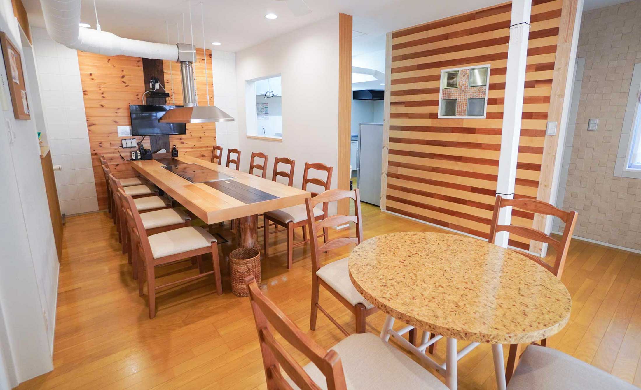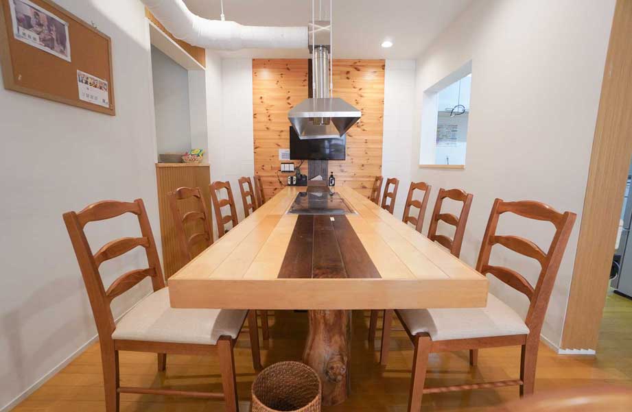 10人掛けの鉄板付きダイニングテーブルに、カフェテーブルも用意してあり、最大で12名ほどの人数で料理や食事を楽しむことができます。