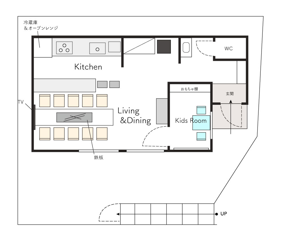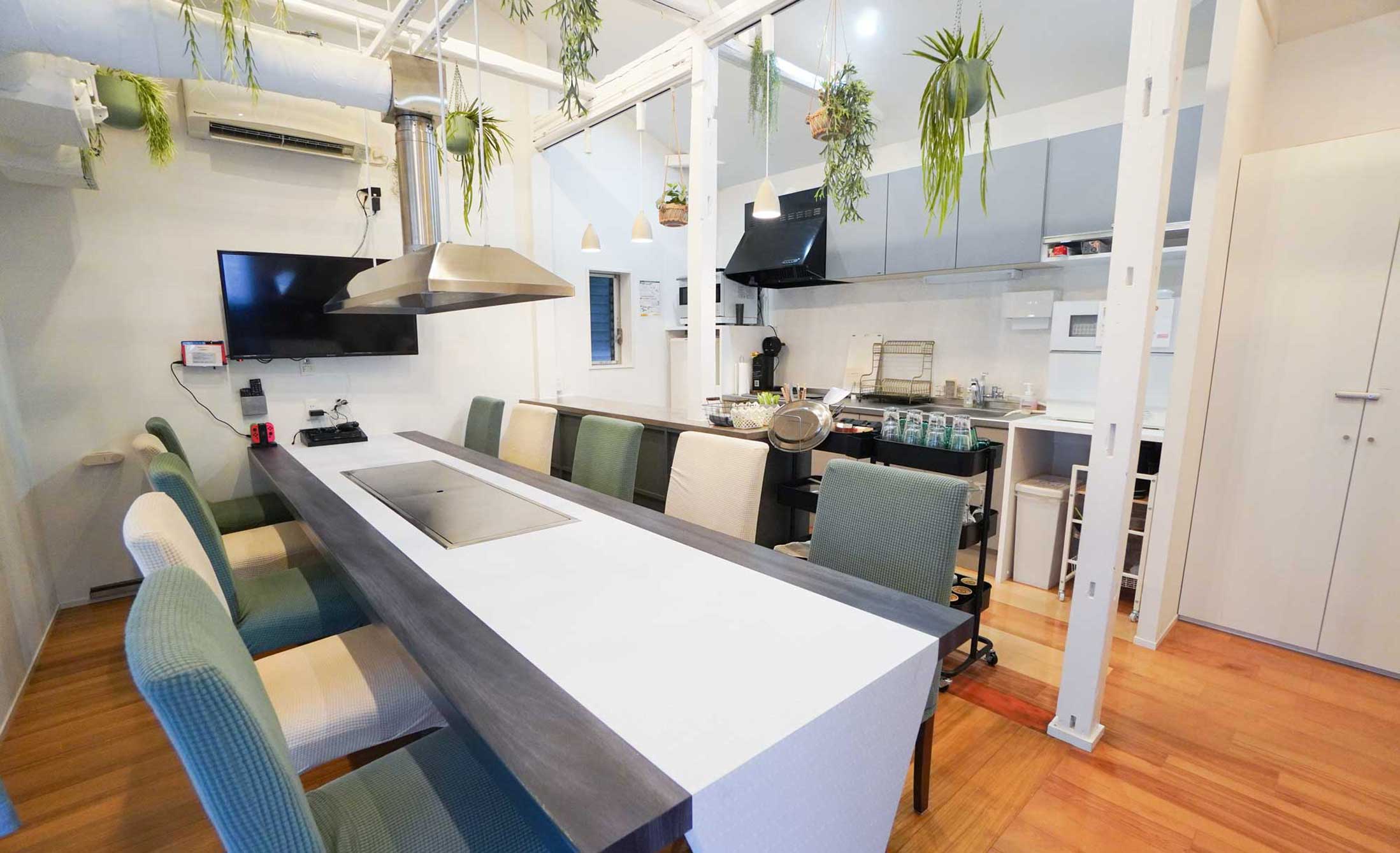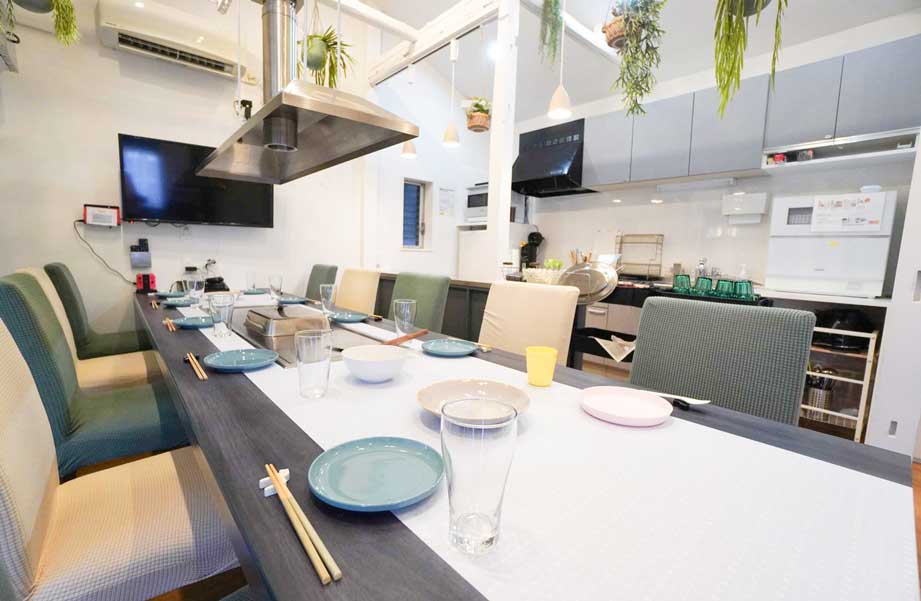10人掛けの鉄板付きダイニングテーブルに、カフェテーブルも用意してあり、最大で10名ほどの人数で食事を楽しむことができます。
