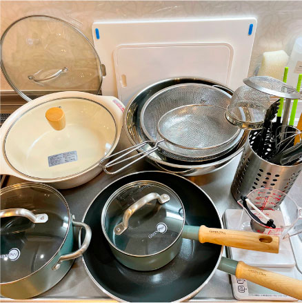 ●使用済のキッチン用品や食器は洗浄のうえ、作業台の上にまとめて置くようお願い致します。
