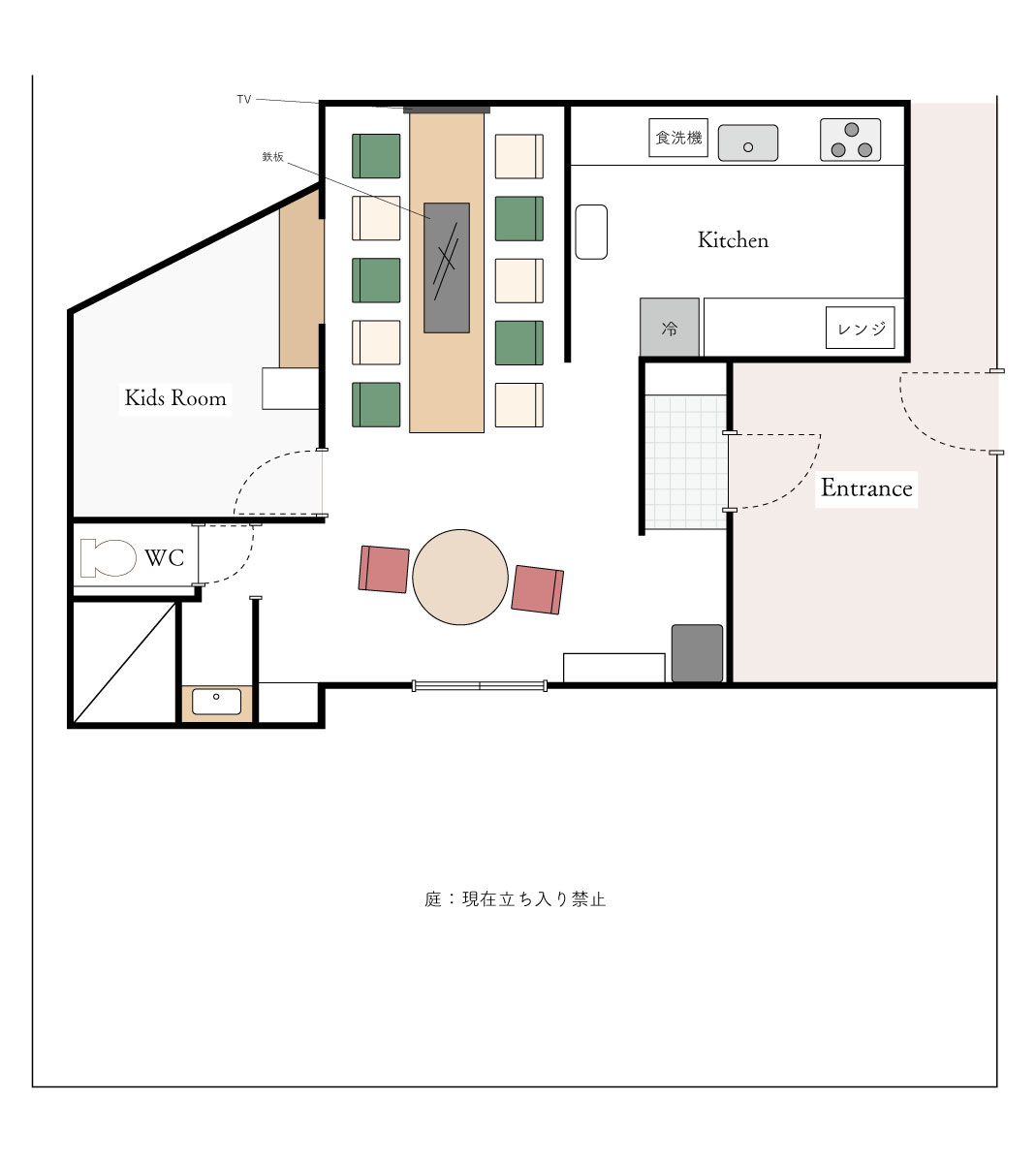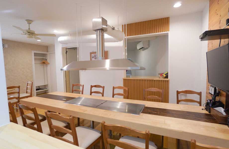 10人掛けの鉄板付きダイニングテーブルに、カフェテーブルも用意してあり、最大で12名ほどの人数で料理や食事を楽しむことができます。